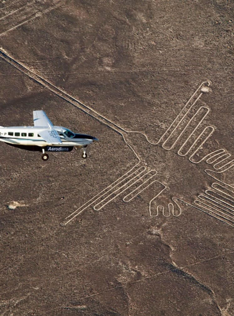 - Posteriormente, realizaremos el sobrevuelo a las famosas Líneas de Nazca, una de las maravillas más enigmáticas del mundo. El vuelo tiene una duración aproximada de 30 a 35 minutos, durante los cuales se pueden observar figuras como el colibrí, el mono, el astronauta, entre otras.